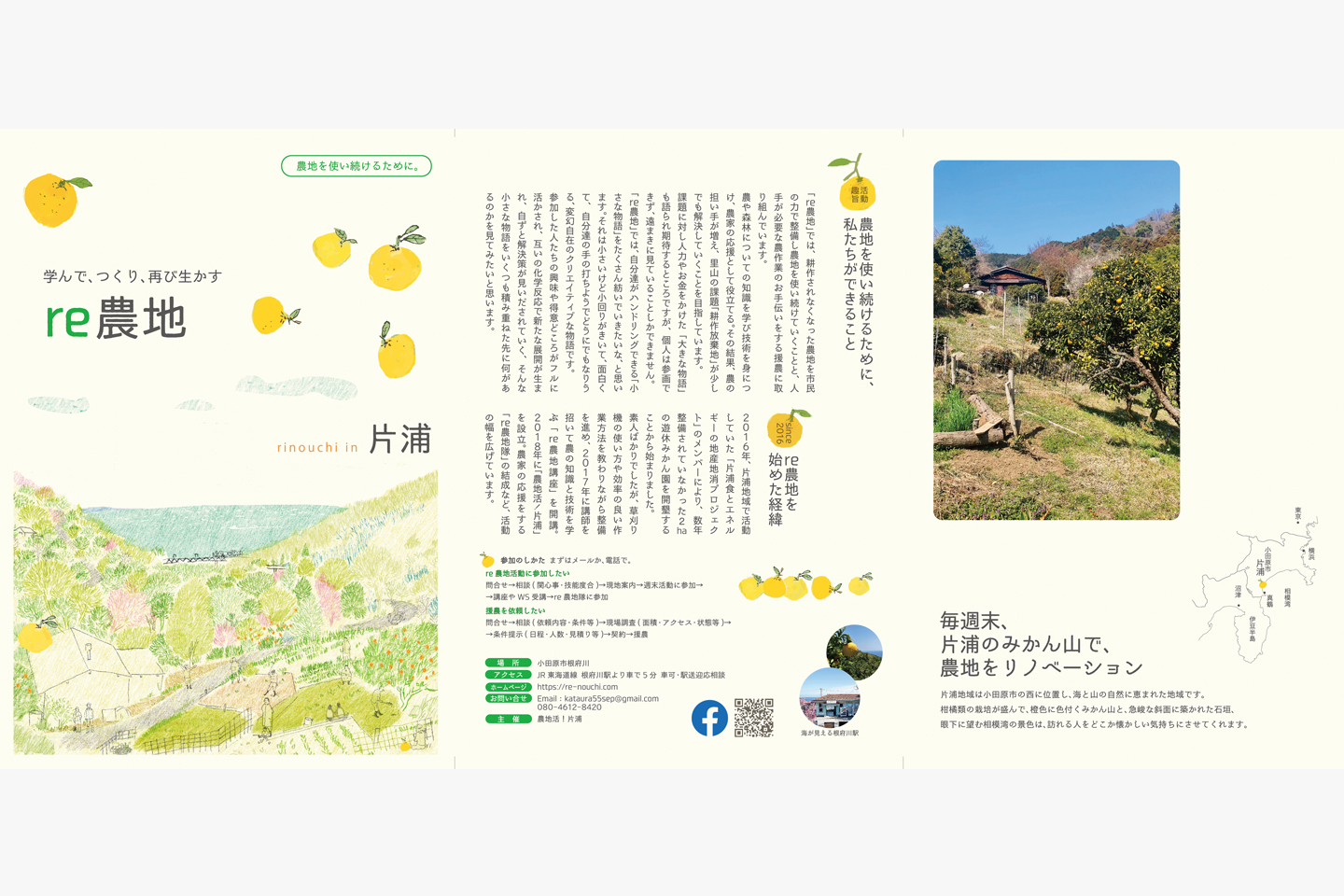 耕作ã•れãªããªã£ãŸè¾²åœ°ã‚’å†ã³ç”Ÿã‹ã™re農地ã¯, 2016å¹´ã‹ã‚‰å°ç”°åŽŸå¸‚ç‰‡æµ¦ã‚’æ‹ ç‚¹ã¨ã—ã¦æ´»å‹•ã—ã¦ã„ã‚‹.